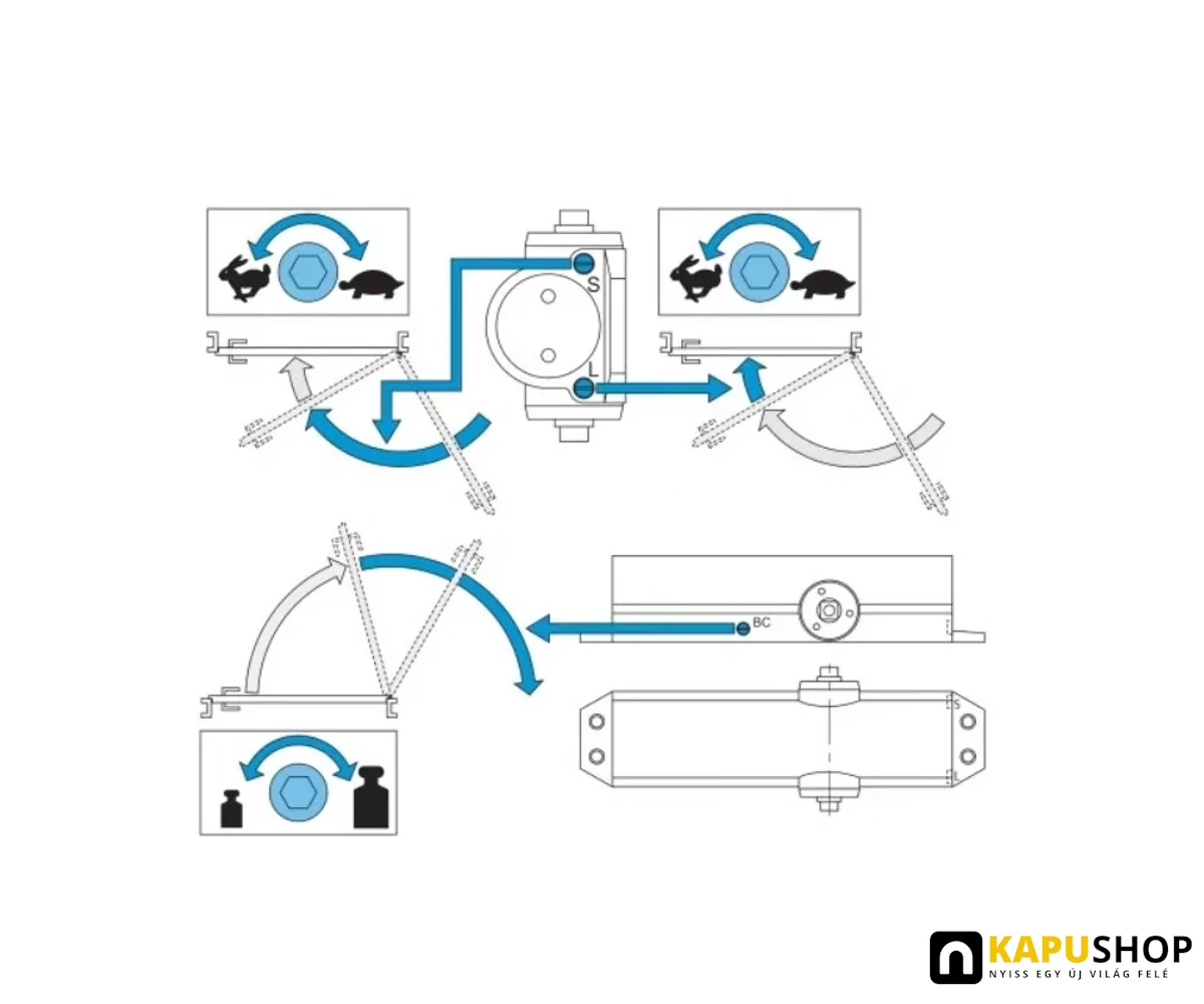 - állítható zárási és reteszelési sebesség, valamint állítható back-check funkció (megvédi az ajtót a hirtelen nyitástól)