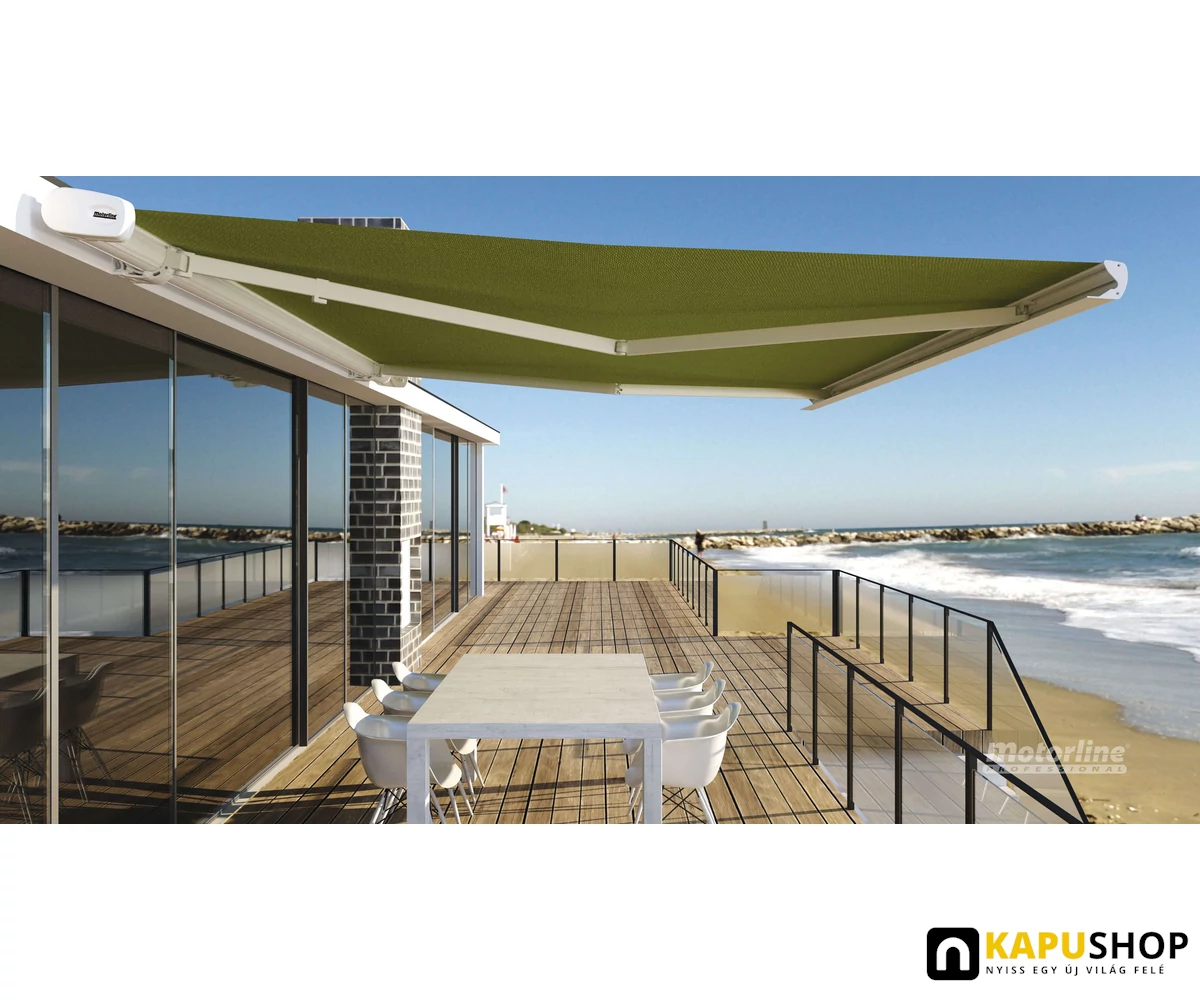 Zárt szerkezetű, csuklókaros motoros napellenző és árnyékoló tokszerkezettel.