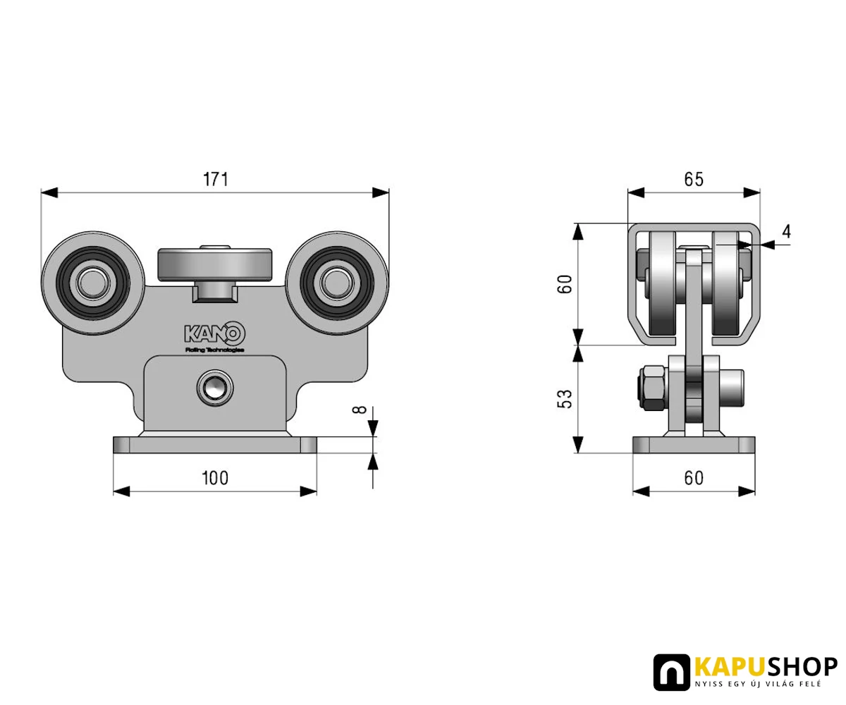Úszókapu görgő G4F, C60-as C-sínhez 5 csapágyas furatos talppal