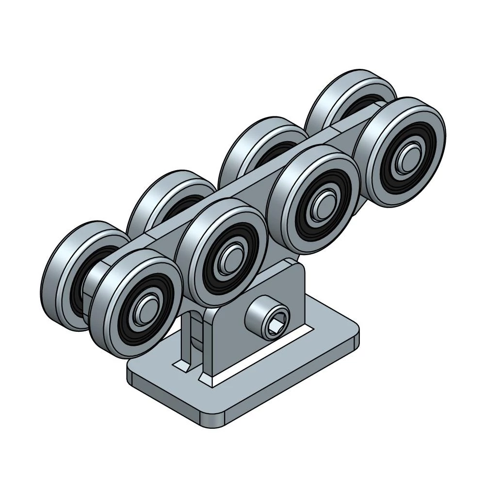 Úszókapu görgő, hat csapágyas fém görgős, 60x60x4 mm-es C-sínekhez.