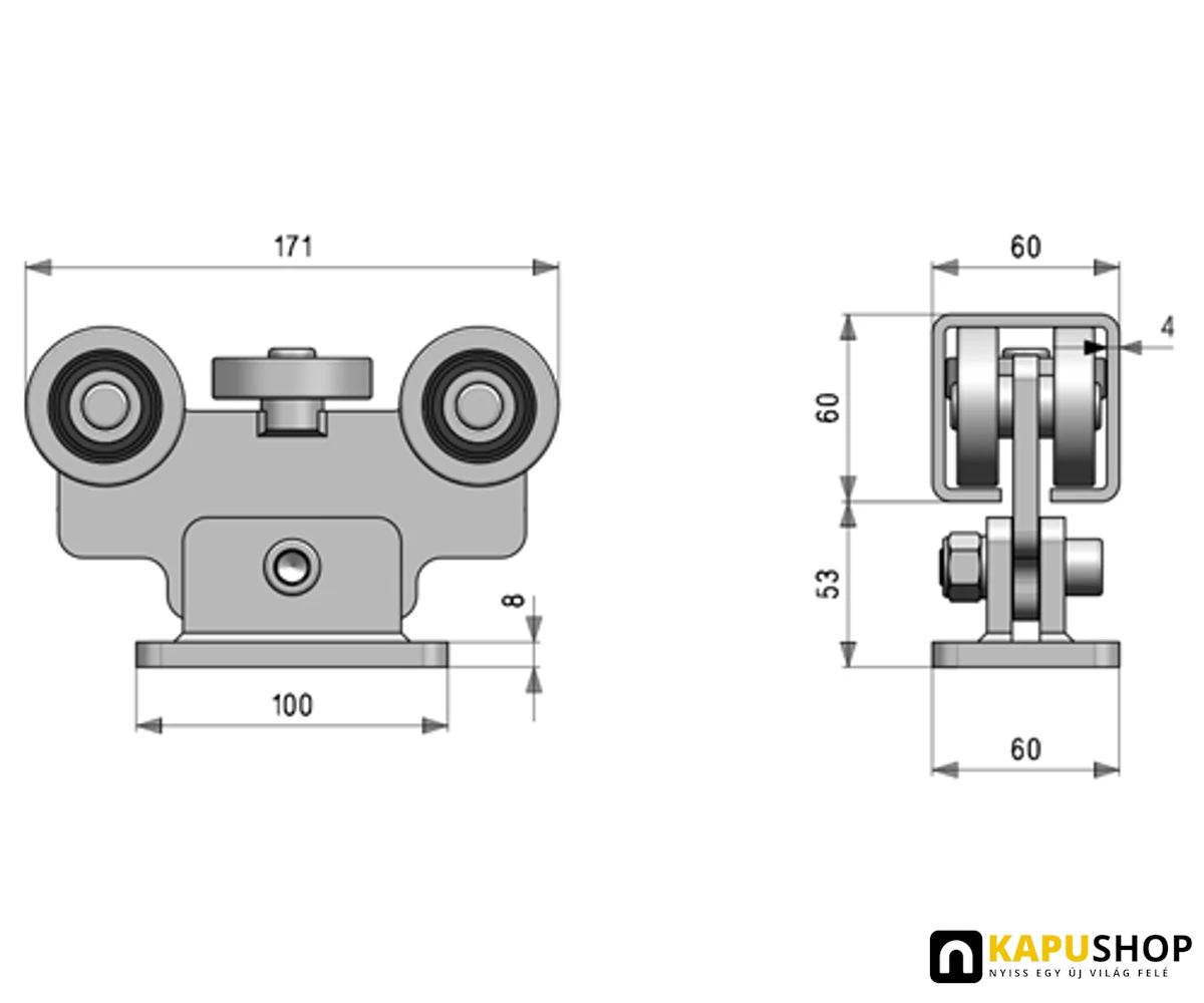 Úszókapu görgő, öt fém görgős, 60x60x4 mm-es C-sínekhez