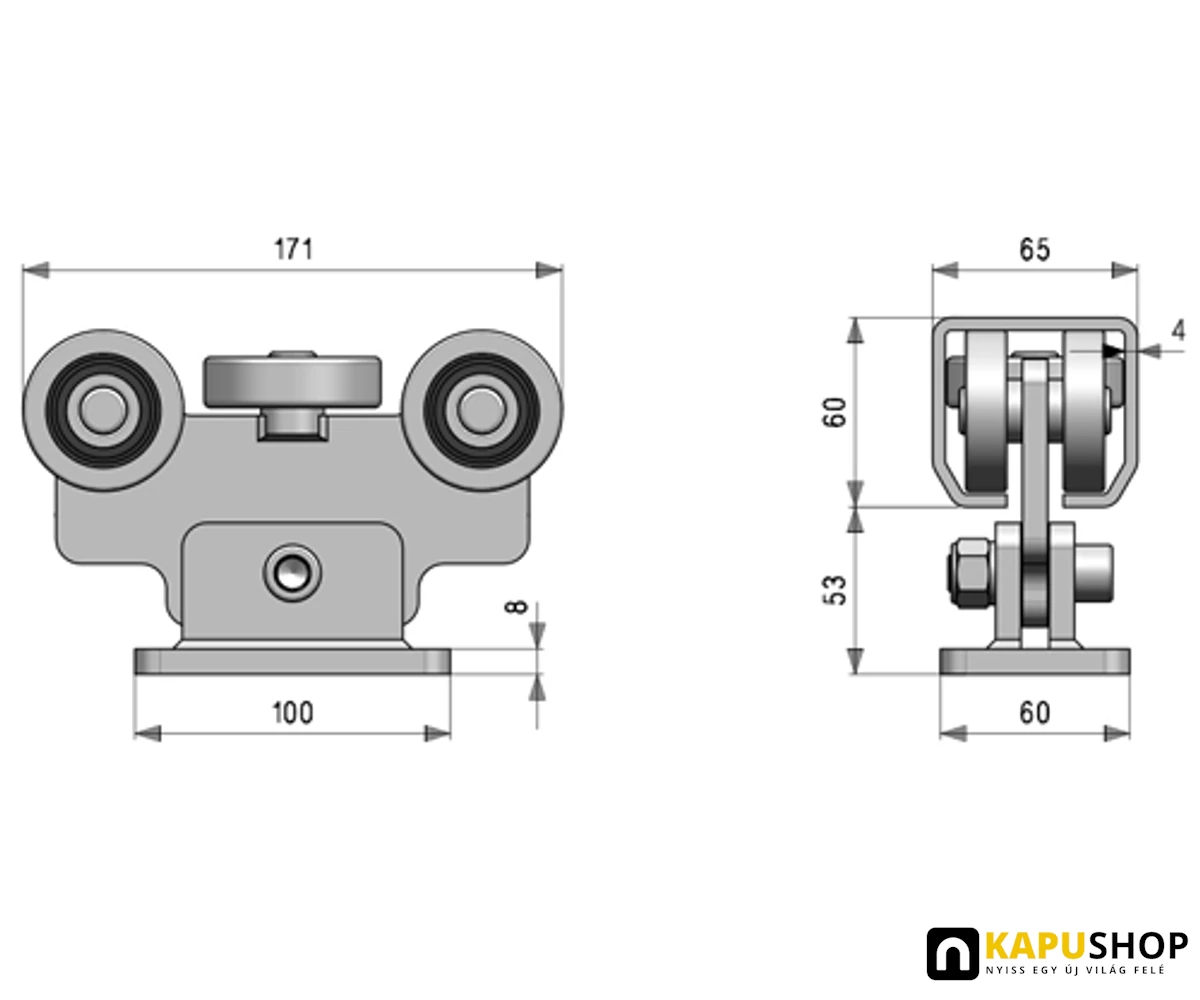 Úszókapu görgő G4F, C60-as C-sínhez 5 csapágyas furatos talppal